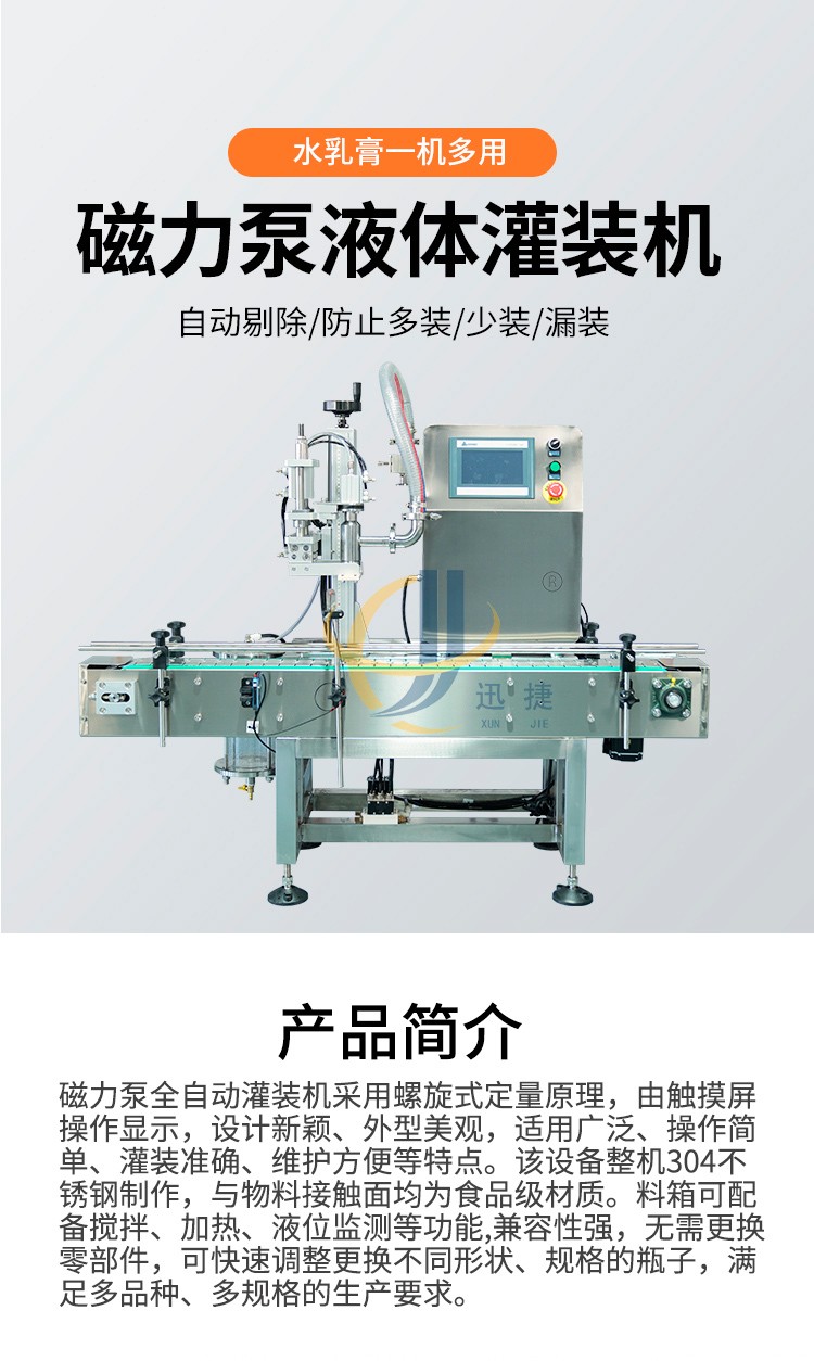 磁力泵全自動(dòng)灌裝機(jī)采用螺旋式定量原理,由觸摸屏操作顯示,設(shè)計(jì)新穎、外型美觀(guān),適用廣泛、操作簡(jiǎn)